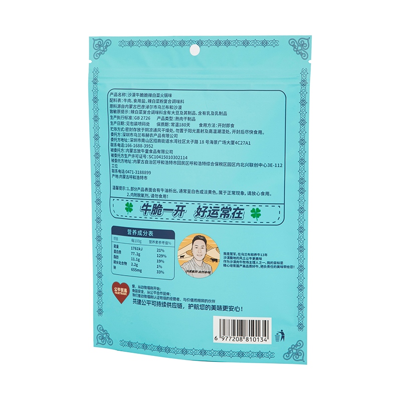袋の表面に印刷された文字は鮮明で、キャットフードの味や製造日などの情報は長期間使用しても消えず、単独の猫家族が大きな袋のフードを保管したり、ペットショップが再包装して販売したりするのに適しています。