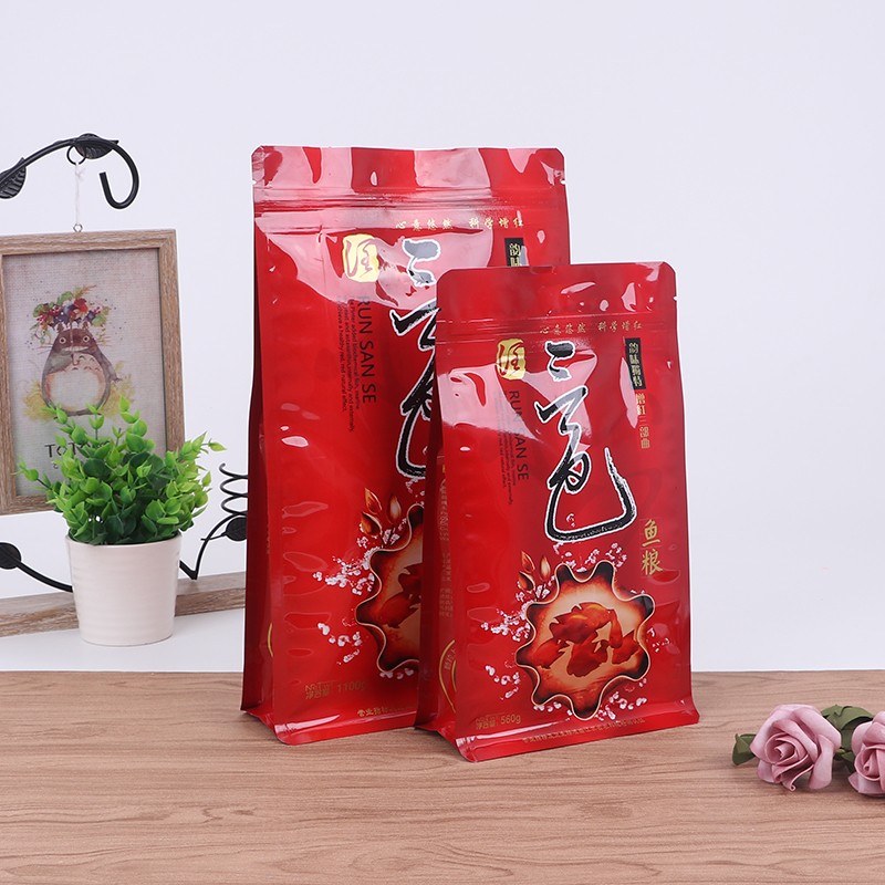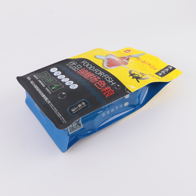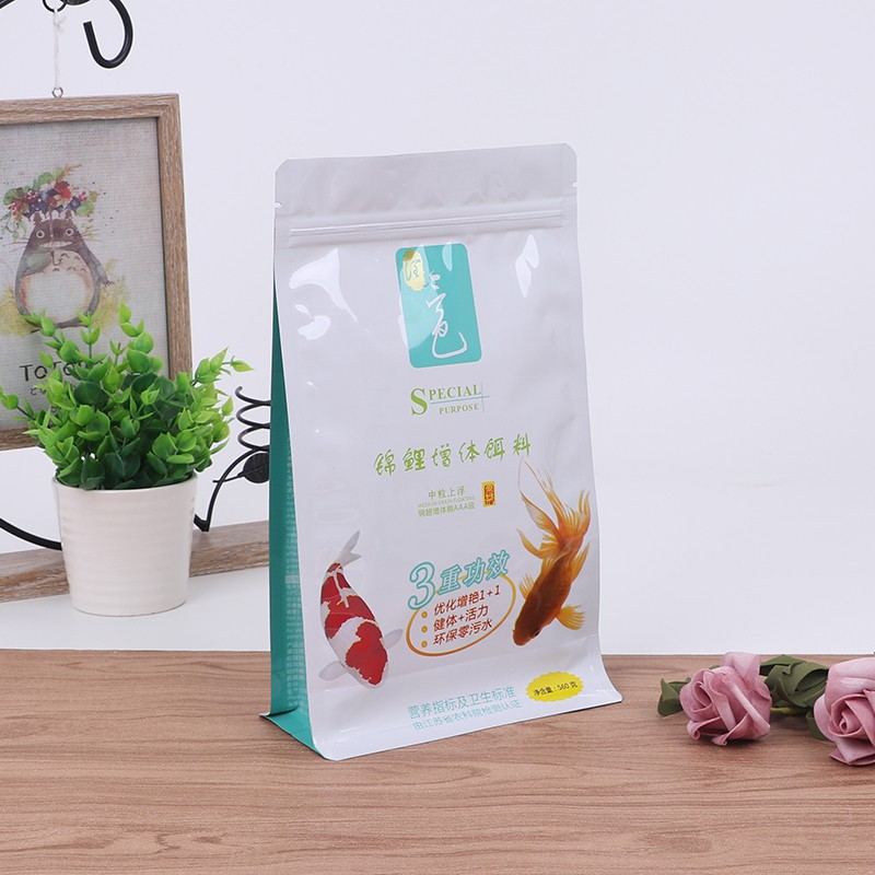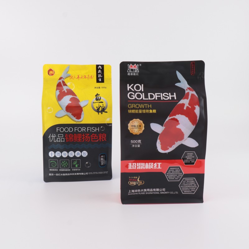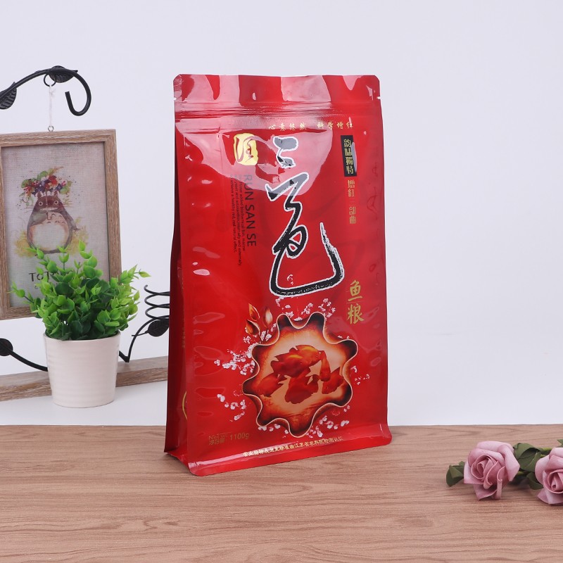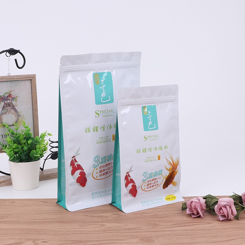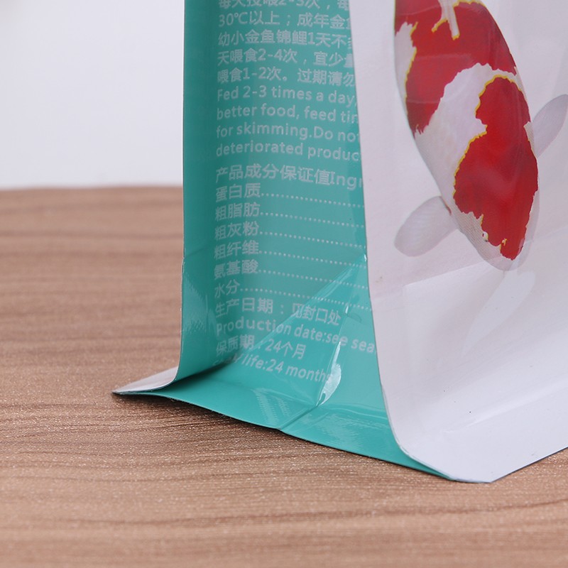 フィッシュフード平底バッグのエッジシールは特にしっかりしており、フィッシュフードの粒子は小さくなります。通常の袋は角から粉が漏れてしまいがちです。このフラットバッグの側面と底部には強化されたエッジシールがあり、魚の餌の粉末が非常に細かい場合でも、漏れることがなく、梱包するのがはるかに便利です。